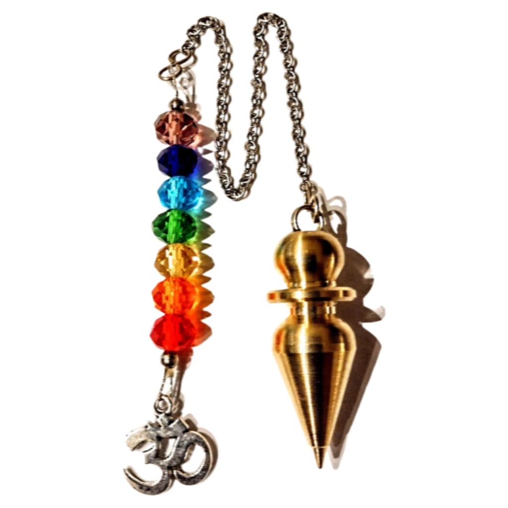 Péndulo 7 CHAKRAS. Realizado en bronce macizo . Cadena con los 7 colores y símbolo.